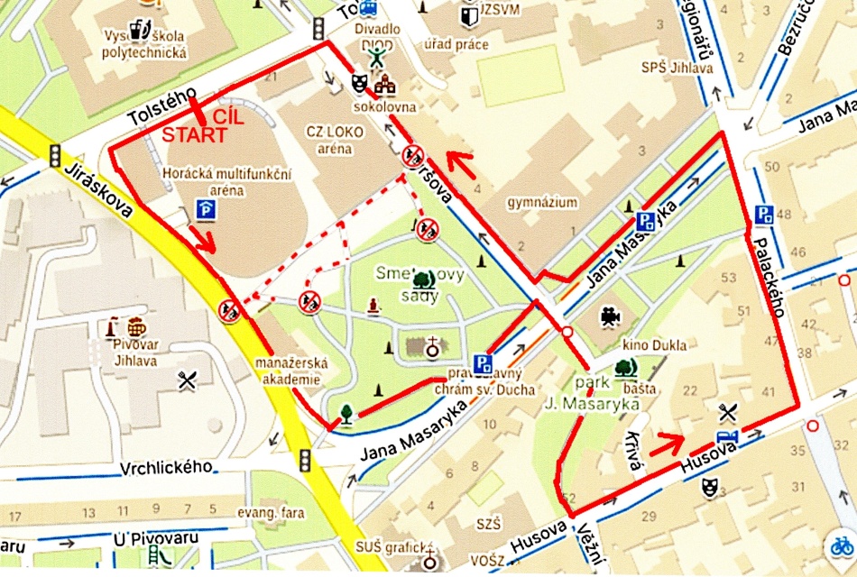 okruh 1200 m vedený kole Aréna a Smetanových sadů, parkem T. G. Masaryka a přilehlými