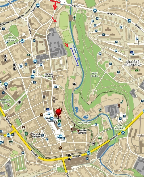 k potoku Jihlávka a směrem po jeho toku k Letnímu kinu.
